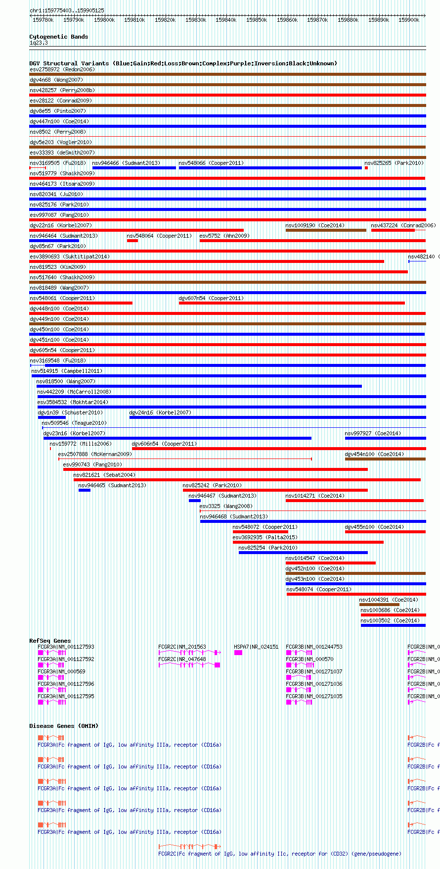 | | Variant Type | CNV gain+loss | | Copy Number | | | Allele State | | | Allele Origin | | | Probe Count | | | Validation Flag | | | Merged Status | M | | Merged Variants | dgv449n100 | | Supporting Variants | nssv3704773, nssv3490850, nssv3492616, nssv3485211, nssv3493496, nssv3491750, nssv3495198, nssv3494820, nssv3483588, nssv3485000, nssv3498652, nssv3492019, nssv3704774, nssv3483033, nssv3498128, nssv3489185, nssv3486922, nssv3484926, nssv3500965, nssv3501741, nssv3496890 | | Samples | | | Known Genes | FCGR2B, FCGR2C, FCGR3A, FCGR3B, HSPA7 | | Method | SNP array | | Analysis | Affymetrix SNP array copy number analysis | | Platform | Affymetrix SNP Array 6.0 | | Comments | | | Reference | Coe_et_al_2014 | | Pubmed ID | 25217958 | | Accession Number(s) | nsv997331