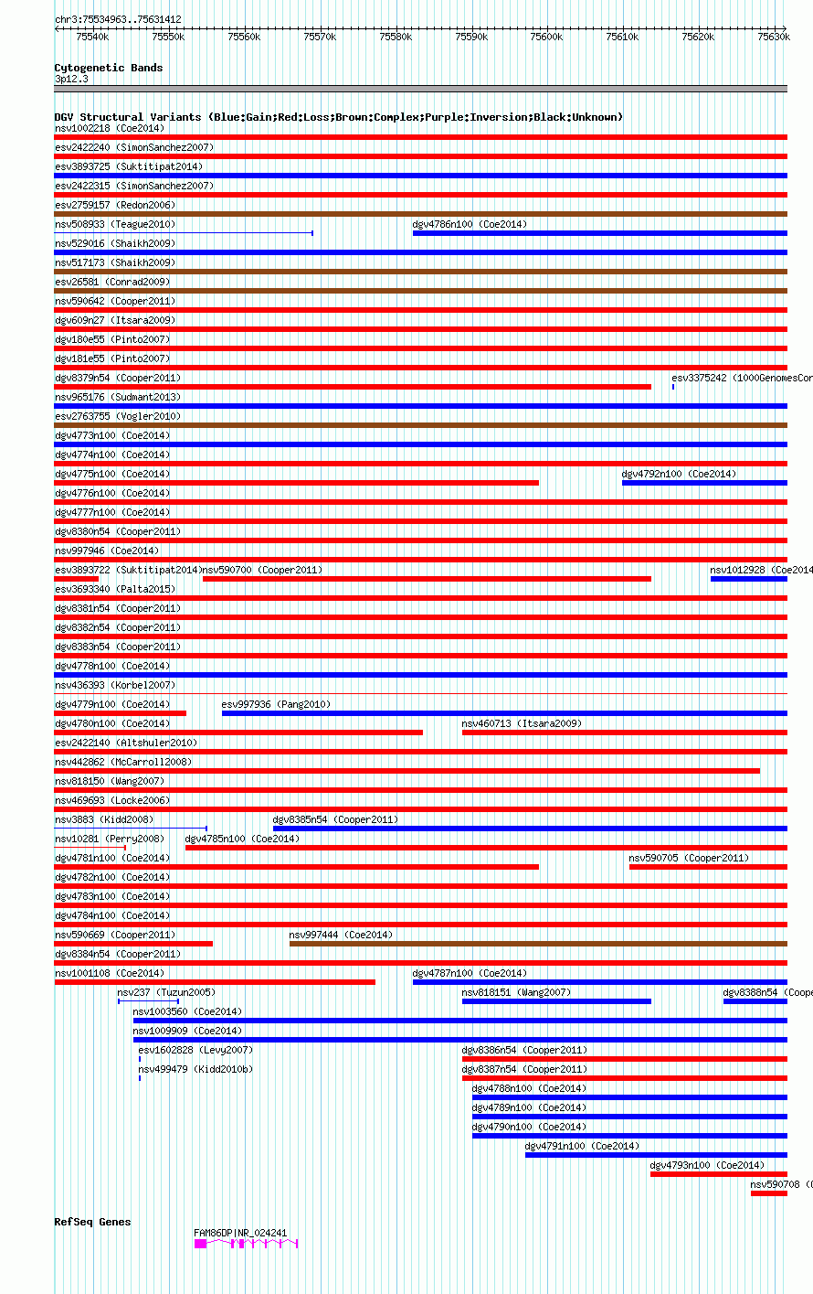 Variant DetailsVariant: nsv997457| Internal ID | 19156993 | | Landmark | | | Location Information | | | Cytoband | 3p12.3 | | Allele length | | Assembly | Allele length | | hg38 | 96450 | | hg19 | 96450 | | hg18 | 96450 |