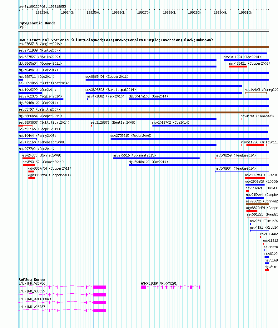 Variant DetailsVariant: nsv997702| Internal ID | 19157239 | | Landmark | | | Location Information | | | Cytoband | 3q29 | | Allele length | | Assembly | Allele length | | hg38 | 98250 | | hg19 | 98250 | | hg18 | 98250 |