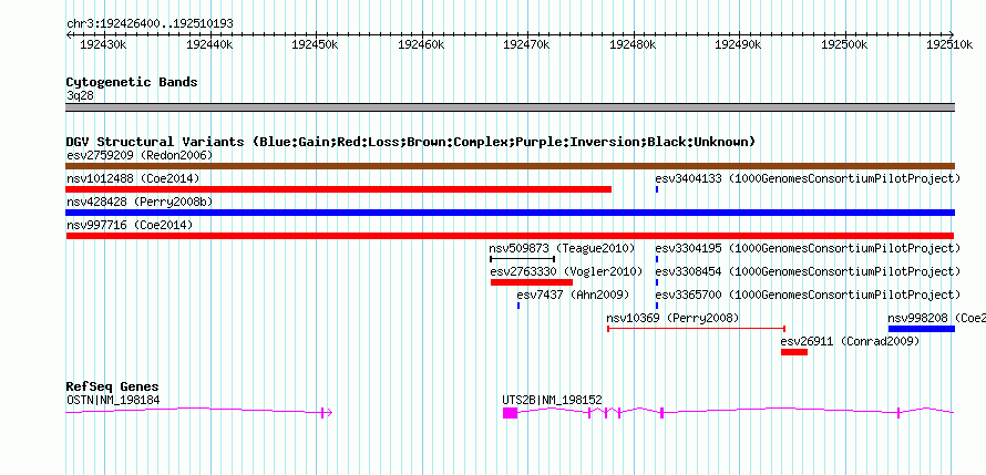 | | Variant Type | CNV loss | | Copy Number | | | Allele State | | | Allele Origin | | | Probe Count | | | Validation Flag | | | Merged Status | M | | Merged Variants | | | Supporting Variants | nssv3611331 | | Samples | | | Known Genes | OSTN, UTS2B | | Method | SNP array | | Analysis | Affymetrix SNP array copy number analysis | | Platform | Affymetrix SNP Array 6.0 | | Comments | | | Reference | Coe_et_al_2014 | | Pubmed ID | 25217958 | | Accession Number(s) | nsv997716