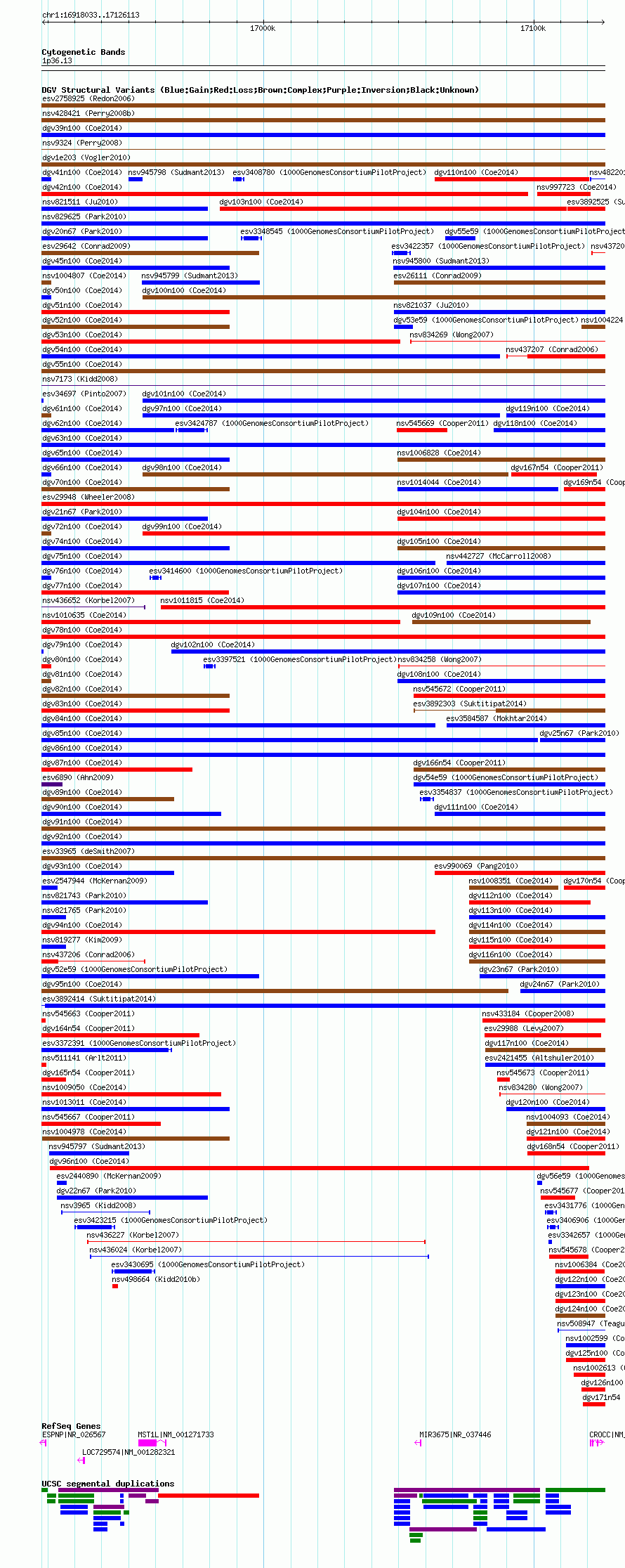 Variant DetailsVariant: nsv998046| Internal ID | 18810896 | | Landmark | | | Location Information | | | Cytoband | 1p36.13 | | Allele length | | Assembly | Allele length | | hg38 | 208081 | | hg19 | 208081 | | hg18 | 208081 |