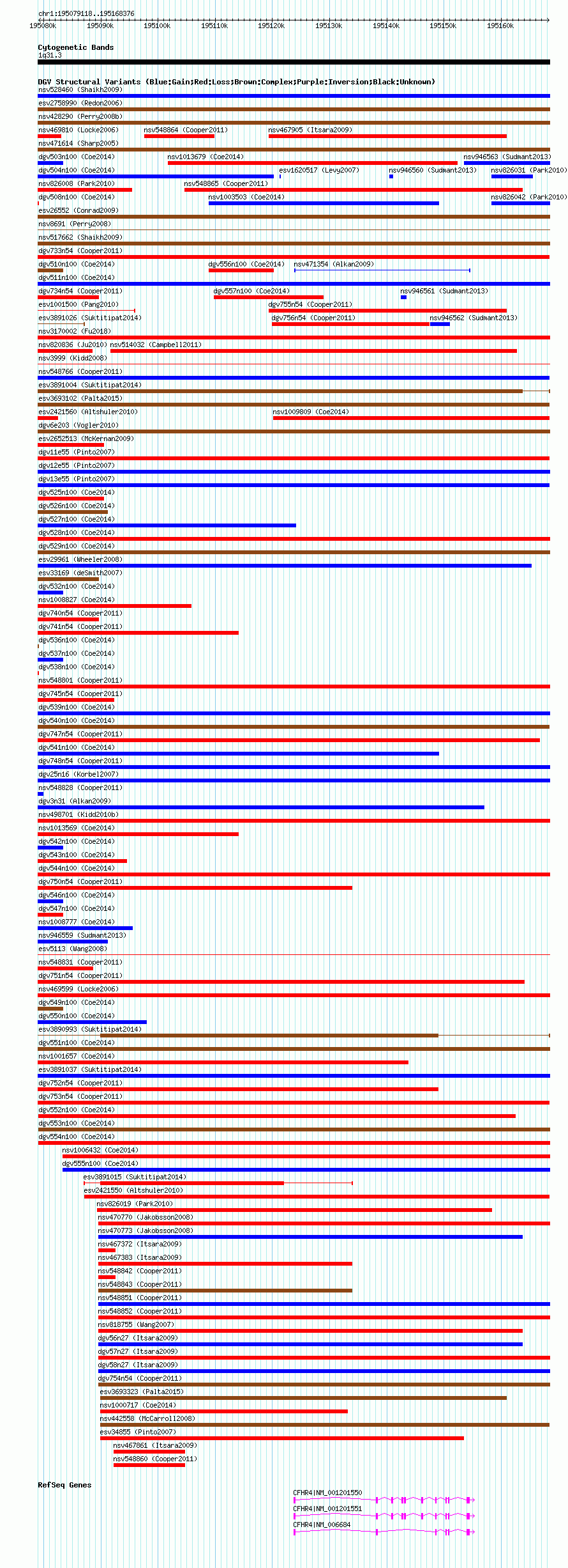 | | Variant Type | CNV gain+loss | | Copy Number | | | Allele State | | | Allele Origin | | | Probe Count | | | Validation Flag | | | Merged Status | M | | Merged Variants | dgv553n100 | | Supporting Variants | nssv3485068, nssv3496775, nssv3489192, nssv3487217, nssv3491319, nssv3498098, nssv3495494, nssv3497903, nssv3484992, nssv3705470, nssv3486417, nssv3494592, nssv3483514, nssv3705469, nssv3485225, nssv3488651, nssv3499062, nssv3499799, nssv3485859, nssv3501691, nssv3488121, nssv3495771, nssv3705472, nssv3492927, nssv3492642, nssv3485652, nssv3500465, nssv3493871, nssv3487362, nssv3489641, nssv3497609, nssv3493729, nssv3493998, nssv3492372, nssv3705471, nssv3495080, nssv3495592, nssv3501724, nssv3501615, nssv3705473, nssv3494838, nssv3489656, nssv3487925, nssv3493895, nssv3485433, nssv3705468, nssv3498799, nssv3502219, nssv3499976 | | Samples | | | Known Genes | CFHR4 | | Method | SNP array | | Analysis | Affymetrix SNP array copy number analysis | | Platform | Affymetrix SNP Array 6.0 | | Comments | | | Reference | Coe_et_al_2014 | | Pubmed ID | 25217958 | | Accession Number(s) | nsv998359