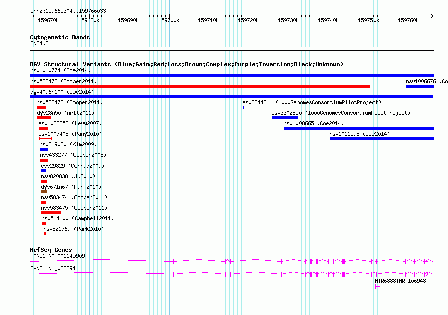 Variant DetailsVariant: nsv998376| Internal ID | 19157912 | | Landmark | | | Location Information | | | Cytoband | 2q24.2 | | Allele length | | Assembly | Allele length | | hg38 | 100731 | | hg19 | 100730 | | hg18 | 100730 |
