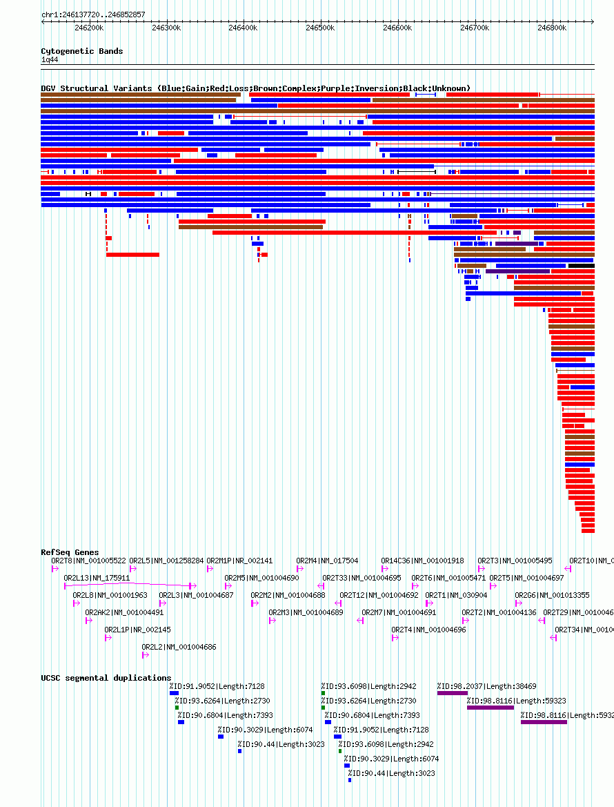 | | Variant Type | CNV gain | | Copy Number | | | Allele State | | | Allele Origin | | | Probe Count | | | Validation Flag | | | Merged Status | M | | Merged Variants | dgv608n100 | | Supporting Variants | nssv3705578 | | Samples | | | Known Genes | OR14C36, OR2AK2, OR2G6, OR2L13, OR2L1P, OR2L2, OR2L3, OR2L5, OR2L8, OR2M1P, OR2M2, OR2M3, OR2M4, OR2M5, OR2M7, OR2T1, OR2T10, OR2T12, OR2T2, OR2T29, OR2T3, OR2T33, OR2T34, OR2T4, OR2T5, OR2T6, OR2T8 | | Method | SNP array | | Analysis | Affymetrix SNP array copy number analysis | | Platform | Affymetrix SNP Array 6.0 | | Comments | | | Reference | Coe_et_al_2014 | | Pubmed ID | 25217958 | | Accession Number(s) | nsv998465
