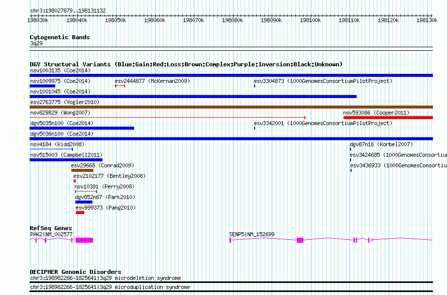 | | Variant Type | CNV gain | | Copy Number | | | Allele State | | | Allele Origin | | | Probe Count | | | Validation Flag | | | Merged Status | M | | Merged Variants | dgv5036n100 | | Supporting Variants | nssv3617003 | | Samples | | | Known Genes | PAK2, SENP5 | | Method | SNP array | | Analysis | Affymetrix SNP array copy number analysis | | Platform | Affymetrix SNP Array 6.0 | | Comments | | | Reference | Coe_et_al_2014 | | Pubmed ID | 25217958 | | Accession Number(s) | nsv998539