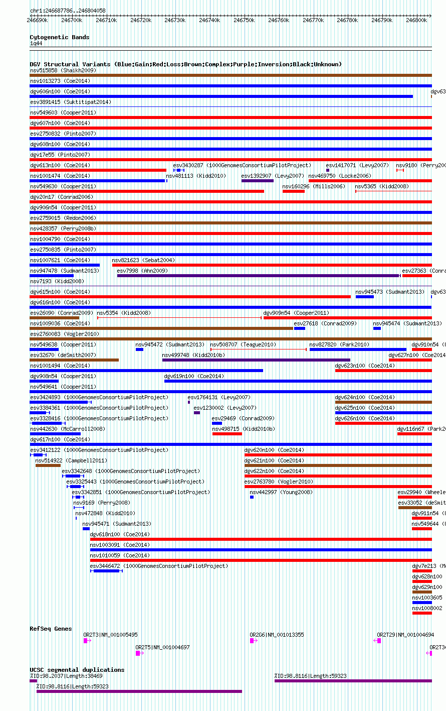 Variant DetailsVariant: nsv998636| Internal ID | 18811486 | | Landmark | | | Location Information | | | Cytoband | 1q44 | | Allele length | | Assembly | Allele length | | hg38 | 116273 | | hg19 | 116273 | | hg18 | 116273 |
