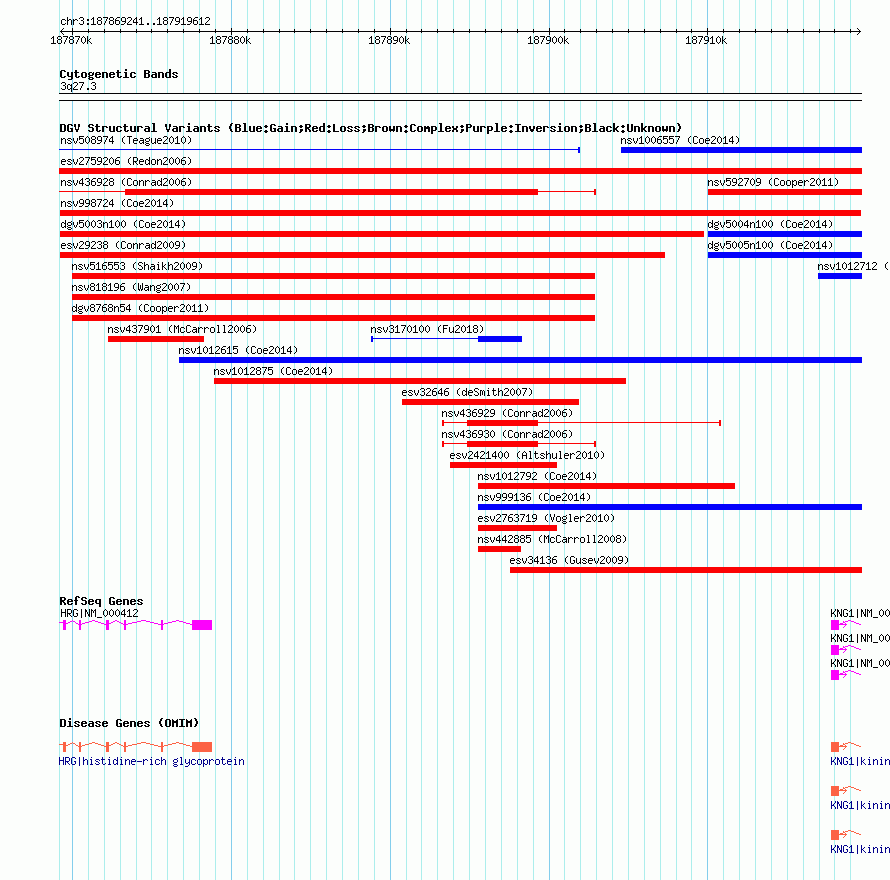| | Variant Type | CNV loss | | Copy Number | | | Allele State | | | Allele Origin | | | Probe Count | | | Validation Flag | | | Merged Status | M | | Merged Variants | | | Supporting Variants | nssv3615015 | | Samples | | | Known Genes | HRG, KNG1 | | Method | SNP array | | Analysis | Affymetrix SNP array copy number analysis | | Platform | Affymetrix SNP Array 6.0 | | Comments | | | Reference | Coe_et_al_2014 | | Pubmed ID | 25217958 | | Accession Number(s) | nsv998724