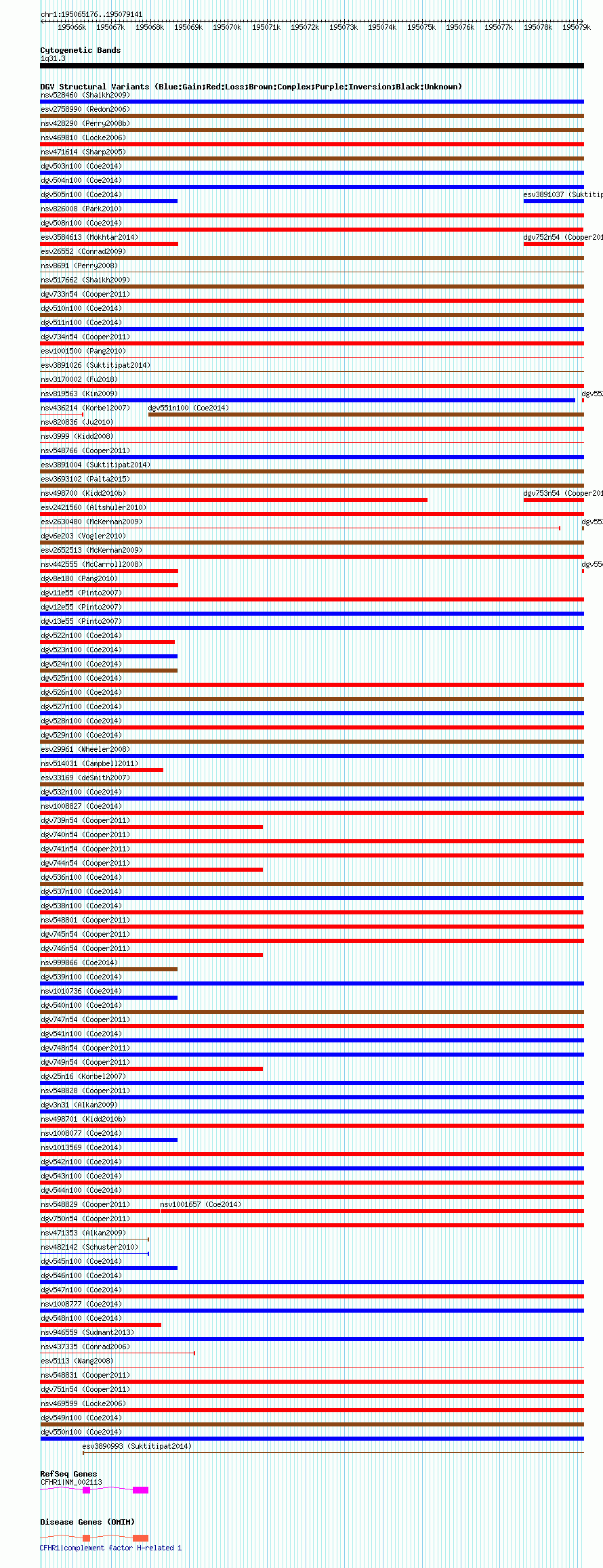 | | Variant Type | CNV gain+loss | | Copy Number | | | Allele State | | | Allele Origin | | | Probe Count | | | Validation Flag | | | Merged Status | M | | Merged Variants | dgv549n100 | | Supporting Variants | nssv3501663, nssv3705443, nssv3497344, nssv3489650, nssv3496016, nssv3705442, nssv3492948, nssv3495472, nssv3488244, nssv3495630, nssv3705441 | | Samples | | | Known Genes | CFHR1 | | Method | SNP array | | Analysis | Affymetrix SNP array copy number analysis | | Platform | Affymetrix SNP Array 6.0 | | Comments | | | Reference | Coe_et_al_2014 | | Pubmed ID | 25217958 | | Accession Number(s) | nsv999209