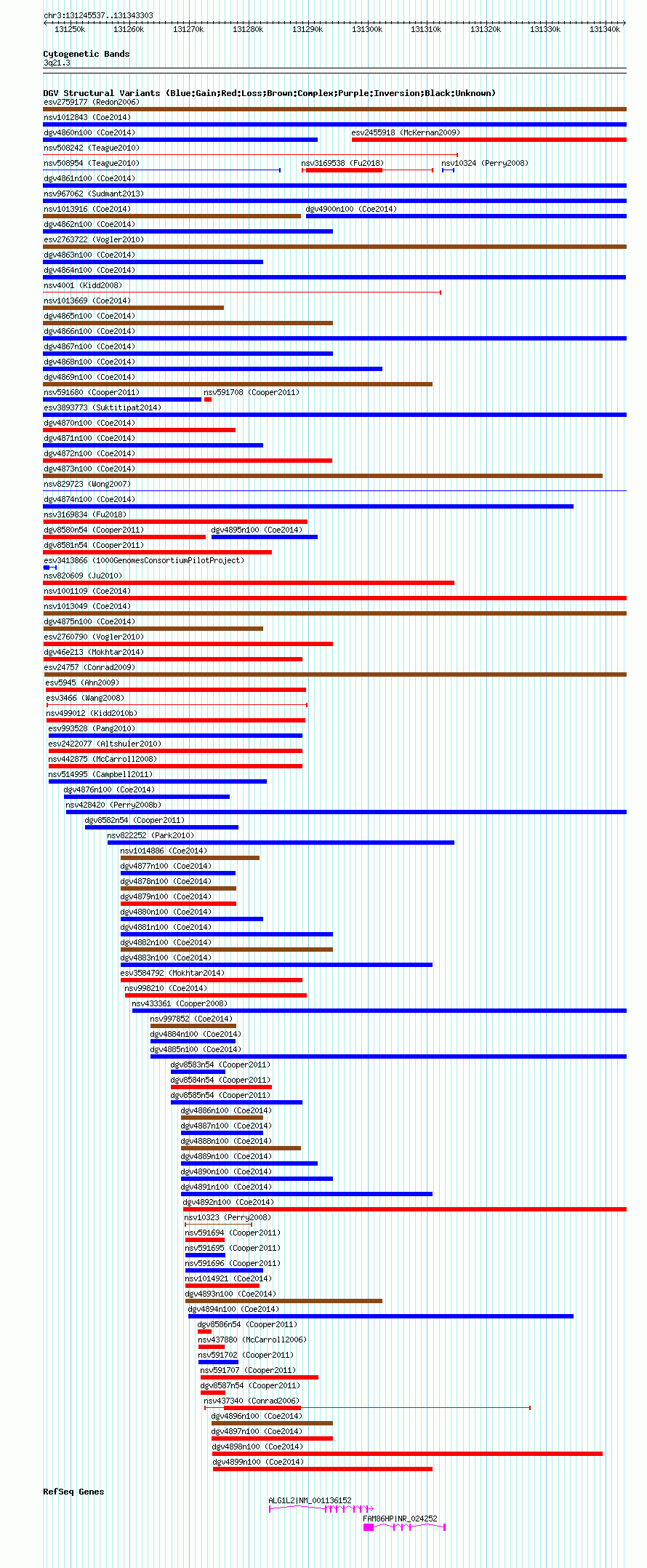 Variant DetailsVariant: nsv999629| Internal ID | 19159165 | | Landmark | | | Location Information | | | Cytoband | 3q21.3 | | Allele length | | Assembly | Allele length | | hg38 | 97767 | | hg19 | 97767 | | hg18 | 97767 |