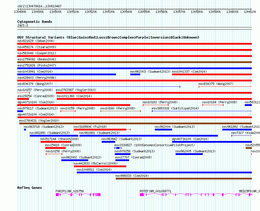 Variant DetailsVariant: nsv999647| Internal ID | 19159183 | | Landmark | | | Location Information | | | Cytoband | 2q21.1 | | Allele length | | Assembly | Allele length | | hg38 | 132054 | | hg19 | 132054 | | hg18 | 132054 |