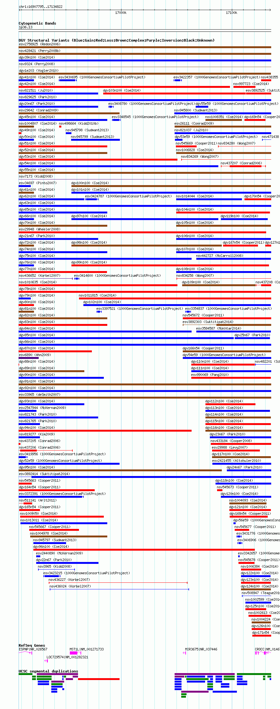 Variant DetailsVariant: nsv999758| Internal ID | 18812608 | | Landmark | | | Location Information | | | Cytoband | 1p36.13 | | Allele length | | Assembly | Allele length | | hg38 | 227028 | | hg19 | 227028 | | hg18 | 227028 |