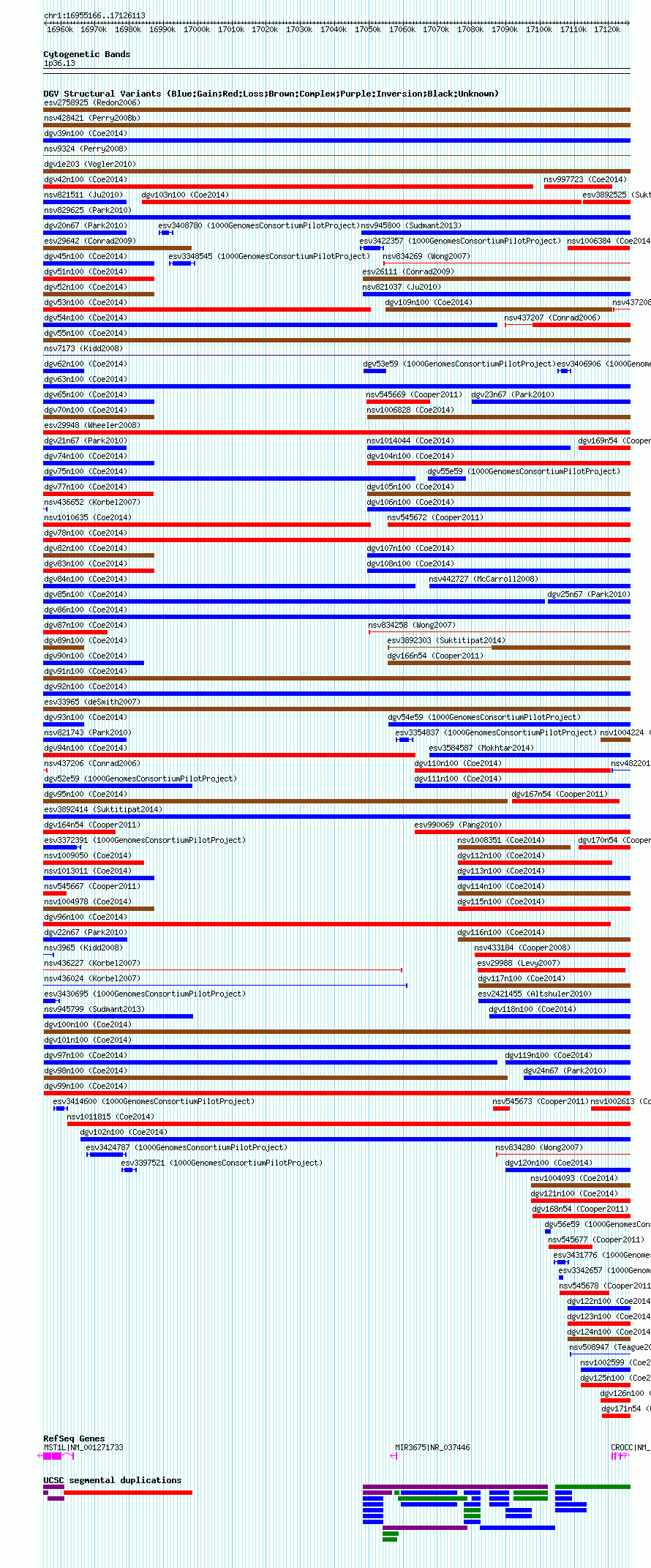 Variant DetailsVariant: nsv999848| Internal ID | 18812698 | | Landmark | | | Location Information | | | Cytoband | 1p36.13 | | Allele length | | Assembly | Allele length | | hg18 | 170948 |