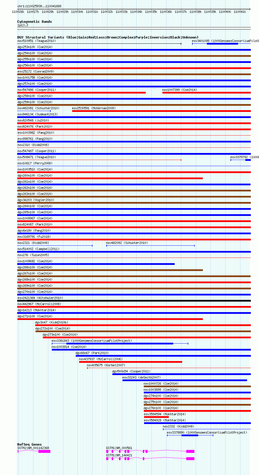 | | Variant Type | CNV gain+loss | | Copy Number | | | Allele State | | | Allele Origin | | | Probe Count | | | Validation Flag | | | Merged Status | M | | Merged Variants | dgv267n100 | | Supporting Variants | nssv3502129, nssv3701723, nssv3489576, nssv3485337, nssv3492405 | | Samples | | | Known Genes | GSTM1, GSTM2 | | Method | SNP array | | Analysis | Affymetrix SNP array copy number analysis | | Platform | Affymetrix SNP Array 6.0 | | Comments | | | Reference | Coe_et_al_2014 | | Pubmed ID | 25217958 | | Accession Number(s) | nsv999907