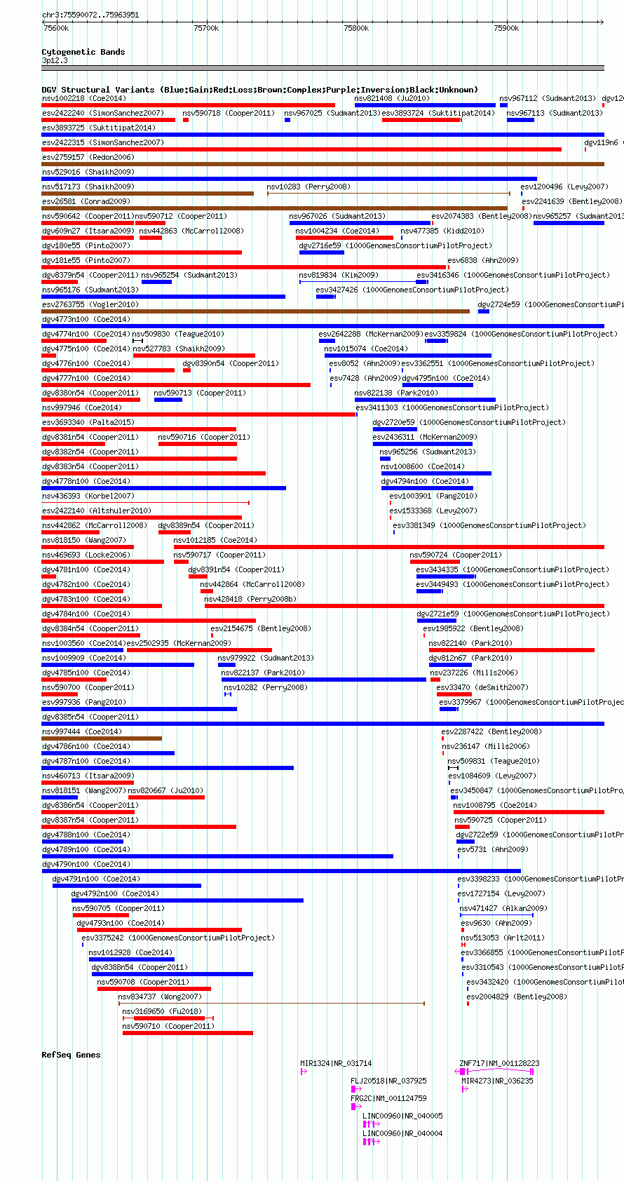 | | Variant Type | CNV gain | | Copy Number | | | Allele State | | | Allele Origin | | | Probe Count | | | Validation Flag | | | Merged Status | M | | Merged Variants | dgv4773n100 | | Supporting Variants | nssv3733729 | | Samples | | | Known Genes | FLJ20518, FRG2C, LINC00960, MIR1324, MIR4273, ZNF717 | | Method | SNP array | | Analysis | Affymetrix SNP array copy number analysis | | Platform | Affymetrix SNP Array 6.0 | | Comments | | | Reference | Coe_et_al_2014 | | Pubmed ID | 25217958 | | Accession Number(s) | nsv999953
