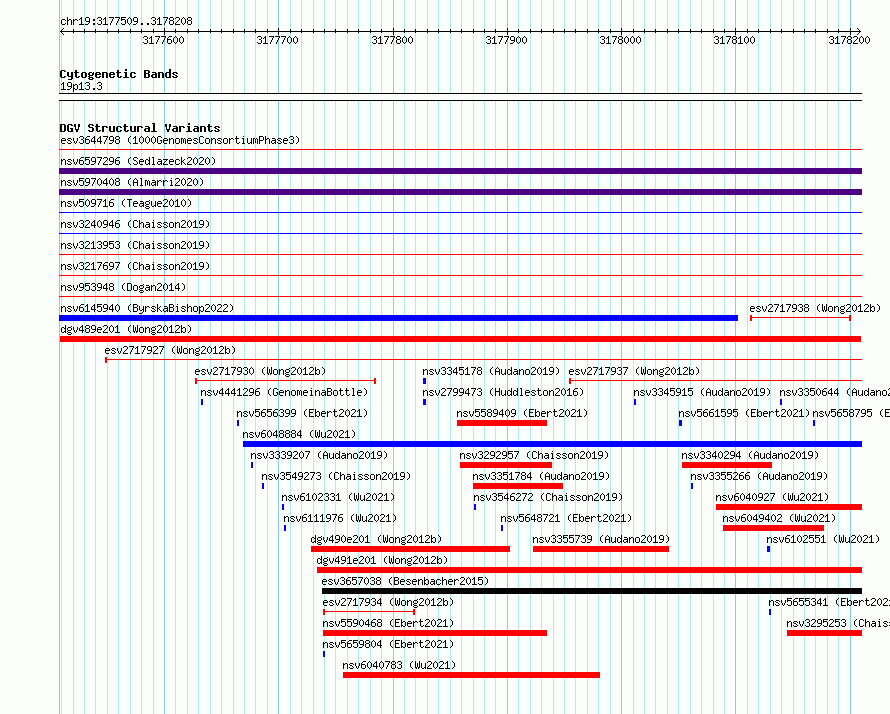 Variant DetailsVariant: dgv489e201| Internal ID | 22759847 | | Landmark | | | Location Information | | | Cytoband | 19p13.3 | | Allele length | | Assembly | Allele length | | hg38 | 700 | | hg19 | 700 |