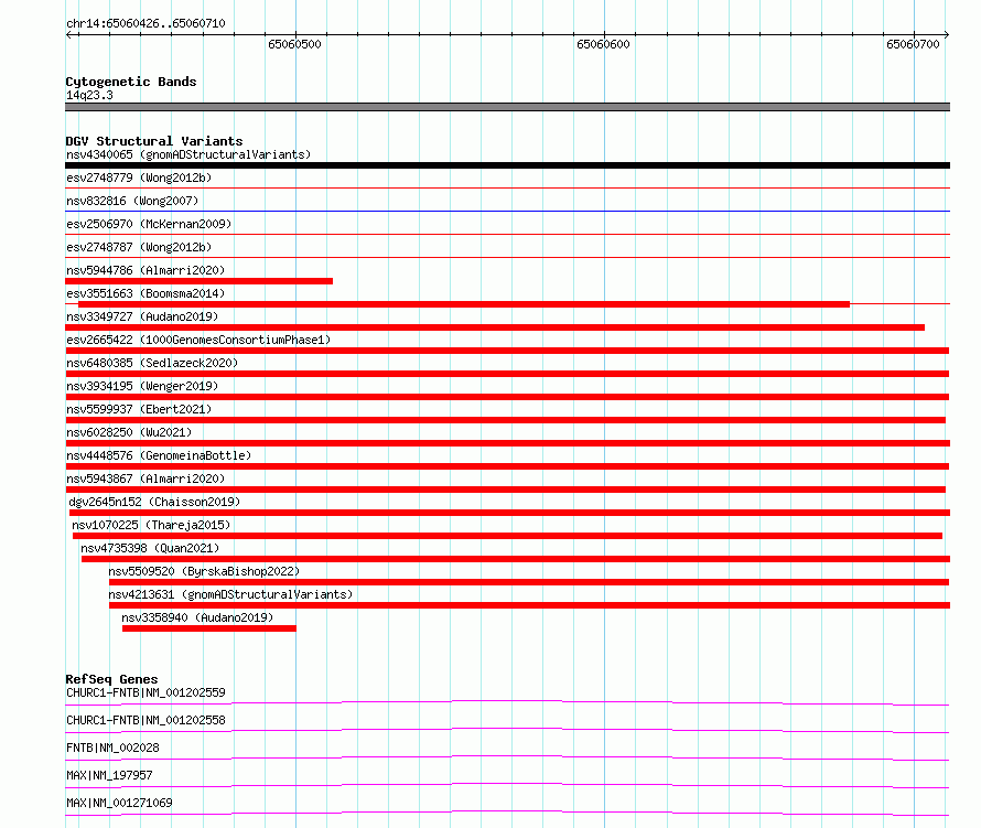 | | Variant Type | CNV deletion | | Copy Number | | | Allele State | | | Allele Origin | | | Probe Count | | | Validation Flag | | | Merged Status | S | | Merged Variants | esv2665422 | | Supporting Variants | | | Samples | HG01079 | | Known Genes | CHURC1-FNTB, FNTB, MAX | | Method | Merging | | Analysis | No reference, merging analysis | | Platform | Merging | | Comments | | | Reference | 1000_Genomes_Consortium_Phase_1 | | Pubmed ID | 23128226 | | Accession Number(s) | essv6006450