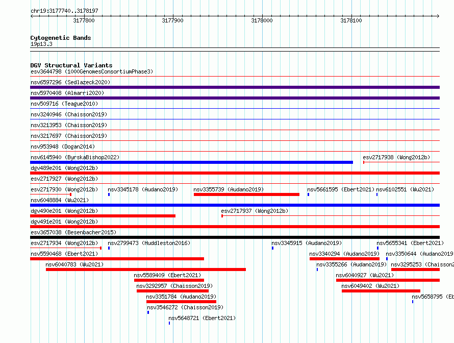 Variant DetailsVariant: essv6735782| Internal ID | 10144785 | | Landmark | | | Location Information | | | Cytoband | 19p13.3 | | Allele length | | Assembly | Allele length | | hg38 | 458 | | hg19 | 458 |