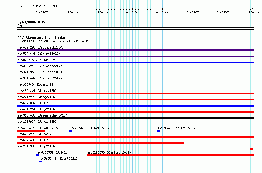 Variant DetailsVariant: essv6820818| Internal ID | 10220343 | | Landmark | | | Location Information | | | Cytoband | 19p13.3 | | Allele length | | Assembly | Allele length | | hg38 | 78 | | hg19 | 78 |