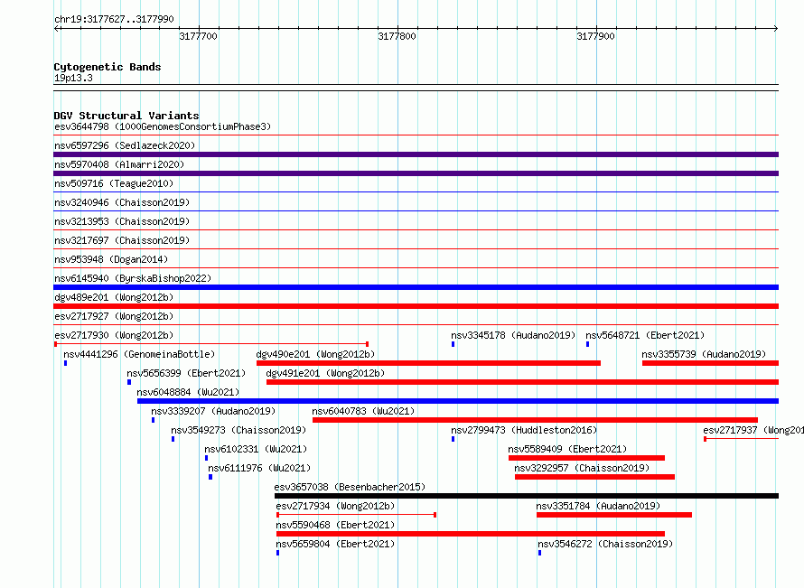 Variant DetailsVariant: essv6832245| Internal ID | 10232501 | | Landmark | | | Location Information | | | Cytoband | 19p13.3 | | Allele length | | Assembly | Allele length | | hg38 | 364 | | hg19 | 364 |