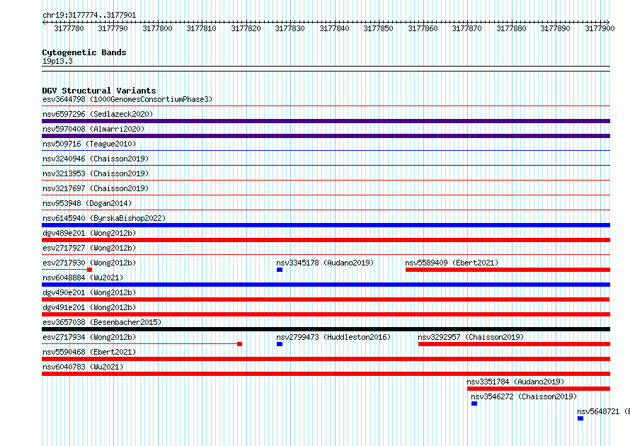Variant DetailsVariant: essv6863546| Internal ID | 10256998 | | Landmark | | | Location Information | | | Cytoband | 19p13.3 | | Allele length | | Assembly | Allele length | | hg38 | 128 | | hg19 | 128 |