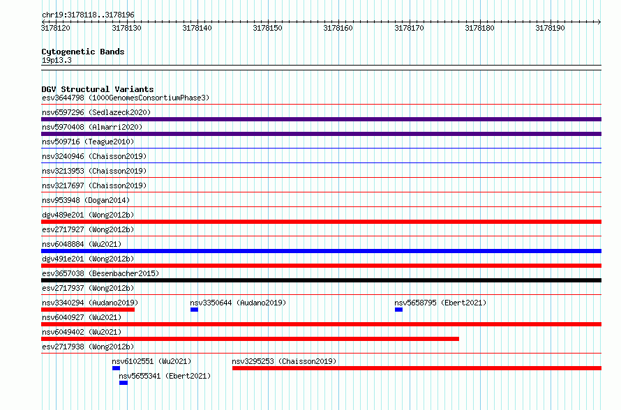Variant DetailsVariant: essv6960922| Internal ID | 10063172 | | Landmark | | | Location Information | | | Cytoband | 19p13.3 | | Allele length | | Assembly | Allele length | | hg38 | 79 | | hg19 | 79 |