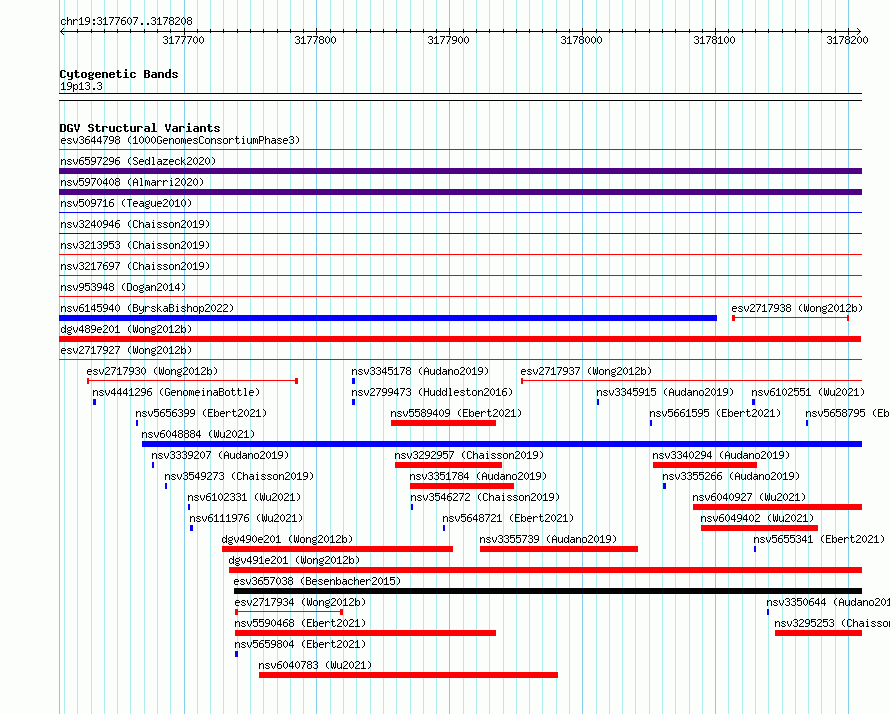 Variant DetailsVariant: esv2717928| Internal ID | 10301564 | | Landmark | | | Location Information | | | Cytoband | 19p13.3 | | Allele length | | Assembly | Allele length | | hg38 | 602 | | hg19 | 602 |
