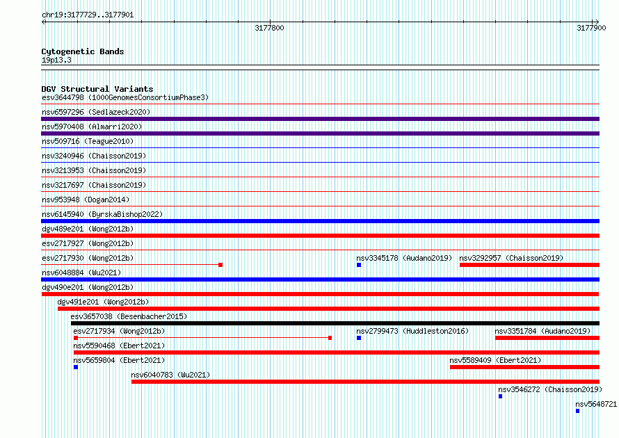 Variant DetailsVariant: esv2717932| Internal ID | 10301568 | | Landmark | | | Location Information | | | Cytoband | 19p13.3 | | Allele length | | Assembly | Allele length | | hg38 | 173 | | hg19 | 173 |